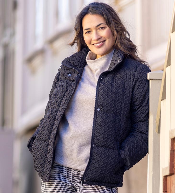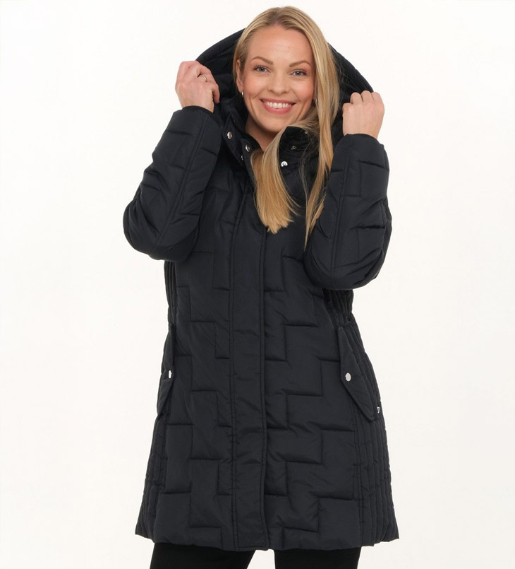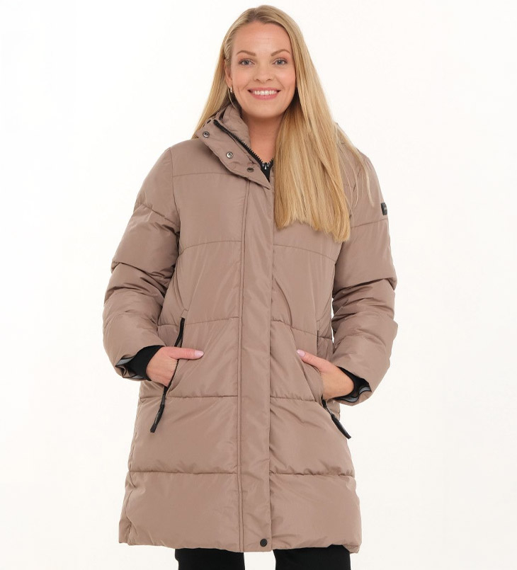 Vil du ha en kortere modell så anbefaler vi Davina. Den er vattert og lett vannavstøtende. Lekkert tredimensjonalt ytterstoff som gir jakken en flott utseende. Jakken har høy krage, glidelåslukking med klaff, lommer i front og elastisk mansjett ved ermene.